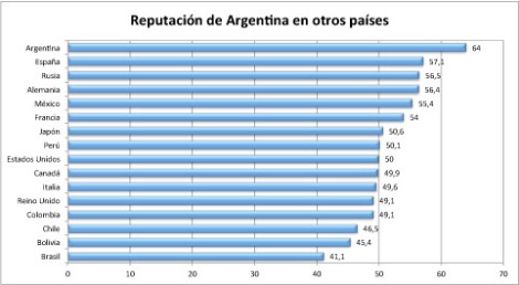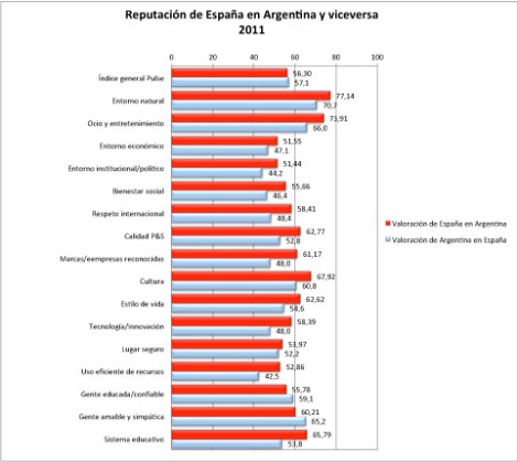 Y los argentinos, ¿acaso sienten por España la misma admiración? Desde luego que no. En el conjunto de los 25 países evaluados por Argentina, España ocupa la 10ª posición con 56,3 puntos, 15 puntos menos que el país por el que los argentinos sienten más admiración: Japón. España es, además, el país europeo que peor valoran los argentinos, sólo superado ?¡faltaría más!? por Reino Unido, pero incluso aquí la distancia con nuestro socios británicos ?12 puntos? es menor que la que nos separa de los japoneses. Para los argentinos tenemos una reputación similar a la de Italia y un poco mejor que la de Chile, su rival de toda la vida.