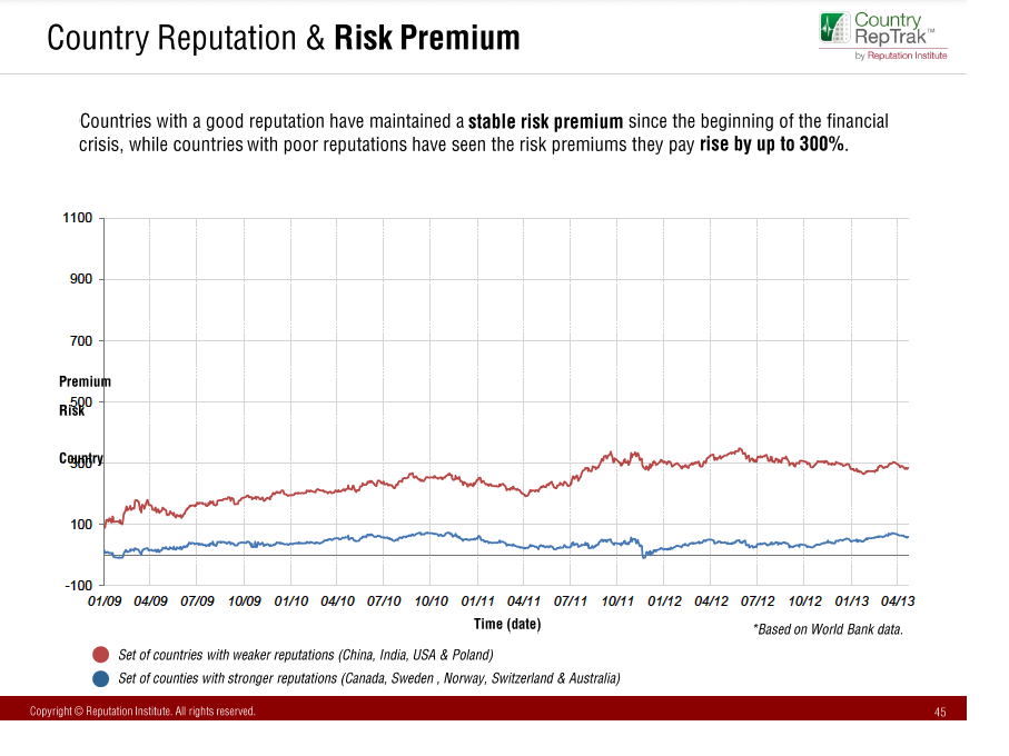 Los países que gozan de una buena reputación se financian en los mercados internacionales a un menor coste que países con peor reputación. En este sentido, la reputación actúa como escudo ante las variaciones al alza de los tipos de interés en coyunturas económicas adversas. Mientras que los países con buena reputación han mantenido su prima de riesgo estable desde el inicio de la crisis financiera, los países con mala reputación han visto crecer esta prima hasta tres veces más.